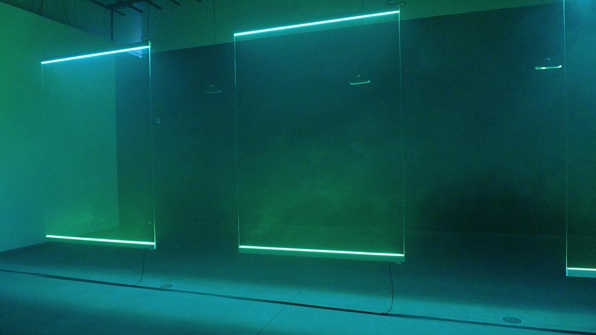 Atmosphere is a series of ephemeral, sensorial-architectural environments combining RGB LED light, barely perceivable sound, infrared heat, and haze. A series of vertically suspended lightweight panels constructed of focused channels of RGB LED’s at the bottom and top, linked together by thin monofilament, gradually change color and opacity over time, the result of shifting qualities of artificially produced haze in the environment. At the same time, small infrared heaters suspended in the area produce changing climates that are not visible but still present to the bodies of visitors who near the panels. Exploring what architecture critic Mark Wigley calls “an architecture of atmosphere,” a sensuous climate of ephemeral yet tangibly felt effects, Atmosphere proposes an ephemeral, almost volatile non object that emphasizes the temporality and changeability of public encounters with our increasingly technical environments. As such, it suggests an absolute complicity between viewer and environment, probing the ways in which the just perceivable opens up new sensory experiences of the world surrounding and enveloping us.