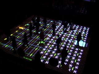 Chronopolis consists of a 10 x 10 meter square floor-projected interface. The computer-generated interface displays days, hours, minutes and seconds, and grids over which four animated pictograms representing these time elements travel. Each pictogram moves at a specific speed, determined by the real time system clock of the computer, leaving a trail of dots behind. The pictograms symbolize flows in the contemporary city – currency, goods, people, and processes of decay.