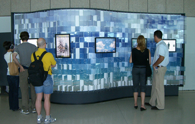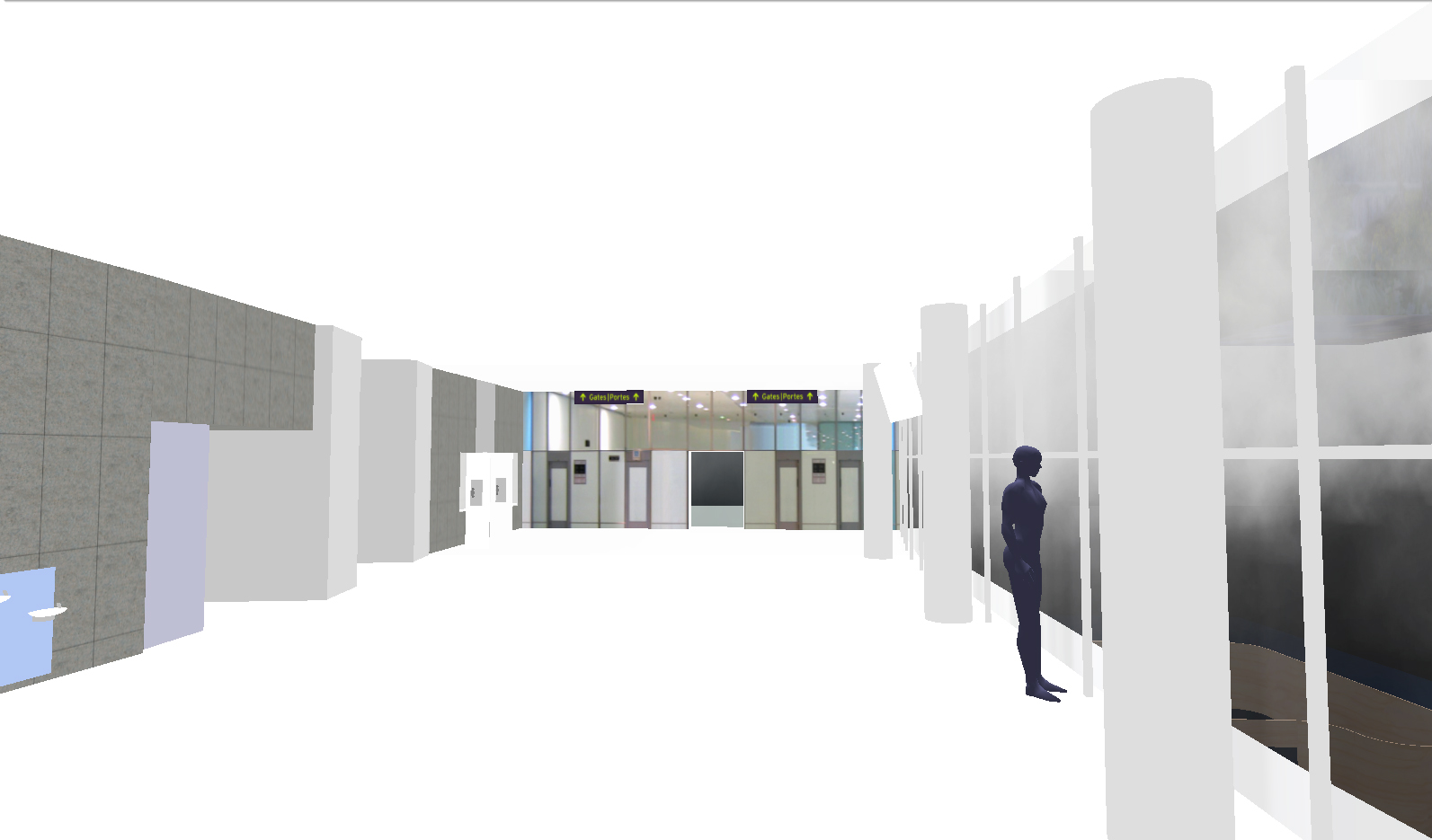 DualTerm explores the contemporary experience of the global airport. Visitors to Toronto’s Pearson Airport’s Terminal One are confronted with a sculptural shape with five embedded plasma screen monitors. On the left most monitor, a computer generated 3-D model of the terminal passage runs inside the online virtual world Second Life. The 3-D model appears to have the same shape as the actual space in which the physical sculpture is housed with the exception that the model is visually reduced in detail. As the real, physically present visitor maneuvers the on-screen avatar through the 3-D terminal model, they encounter a space which is increasingly estranged from the actual terminal building. On one end of the terminal passageway, the visitor crosses through a door and ends up in a glass enclosed room which overlooks the architecturally cluttered Second Life landscape below. The glass enclosed room is filled with noise – real time sounds from the actual terminal passage which are fed into the Second Life model. Looking out onto the Las Vegas-like landscape, the actual visitor thus learns that the terminal building has been constructed in the air.