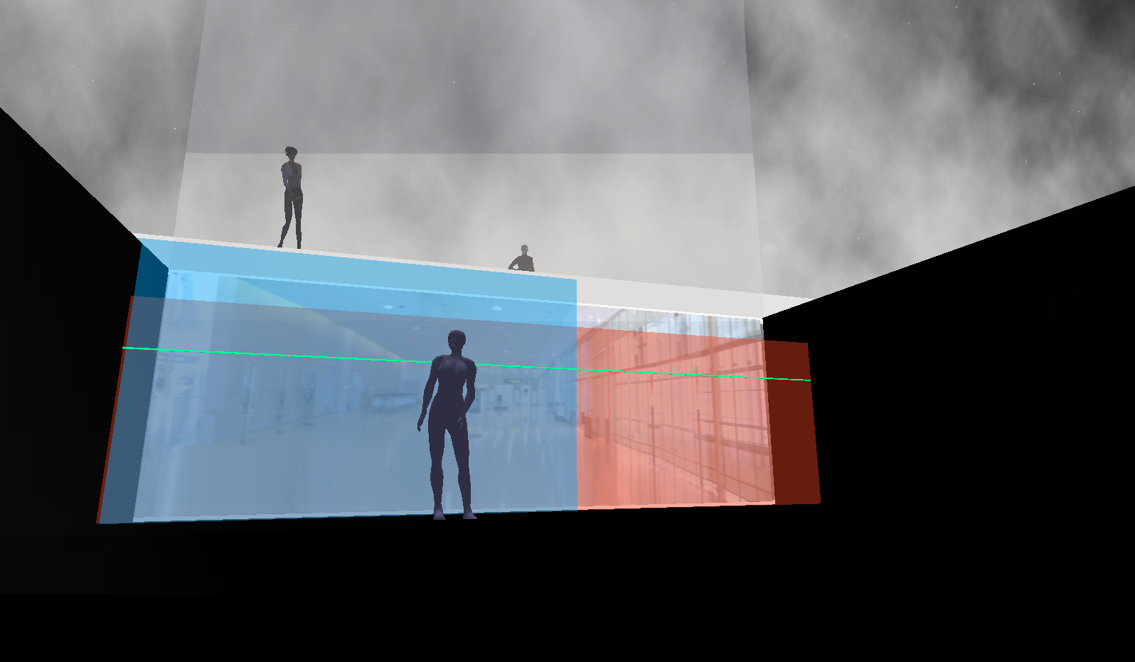 As the visitor guides the avatar out of this glass cube and back into the terminal, the deafening sounds of terminal noise gradually give way to a silence that is punctuated only by the low pulse of a heart beat and a low, throbbing drone. When the visitor exits the other end of the terminal passage, they come up a dark, glass enclosed space which experientially feels like a vacuum. The stars of the Second Life sky can be seen from this vantage point and all of the white noise from the terminal passage finally subsides into a dark, pulsing nothingness.