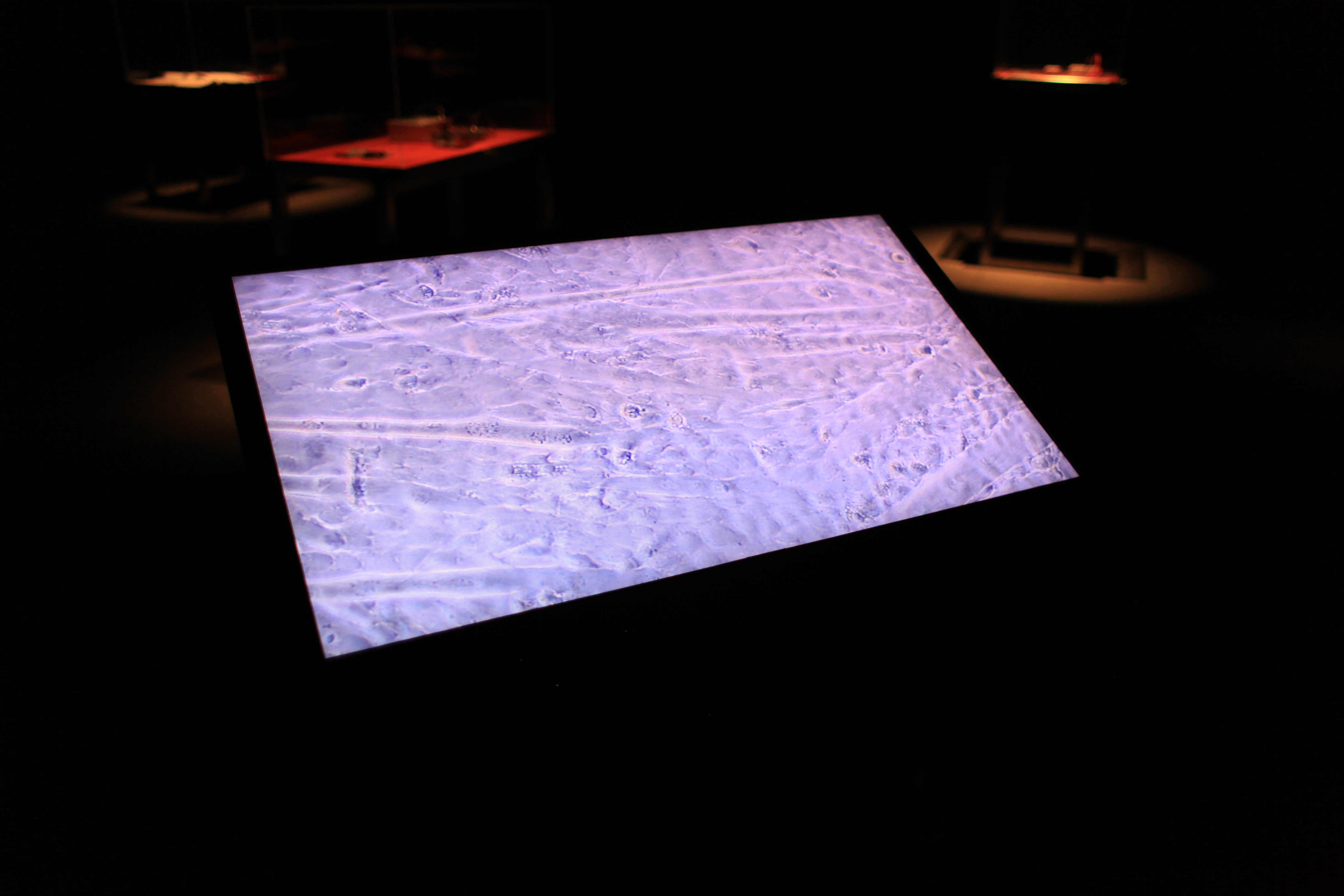 In the exhibition, the tension between human and machinic bodies, the living, semi-living or non-living is correlated with the very thresholds of human perception: the humble, almost invisible and barely perceptible random twitches of microscopic muscle cells in a dish rather than the efficient and apparent movement of a well-oiled machine. This human dream of engineering life may thus turn out to be, in the end, just a vapour in the wind.