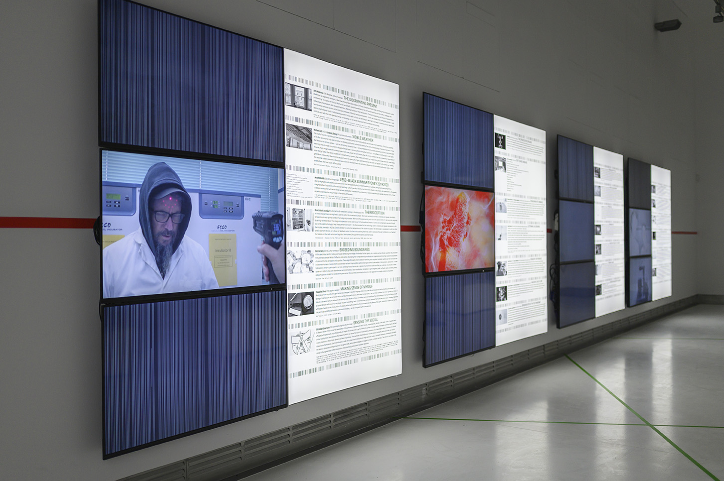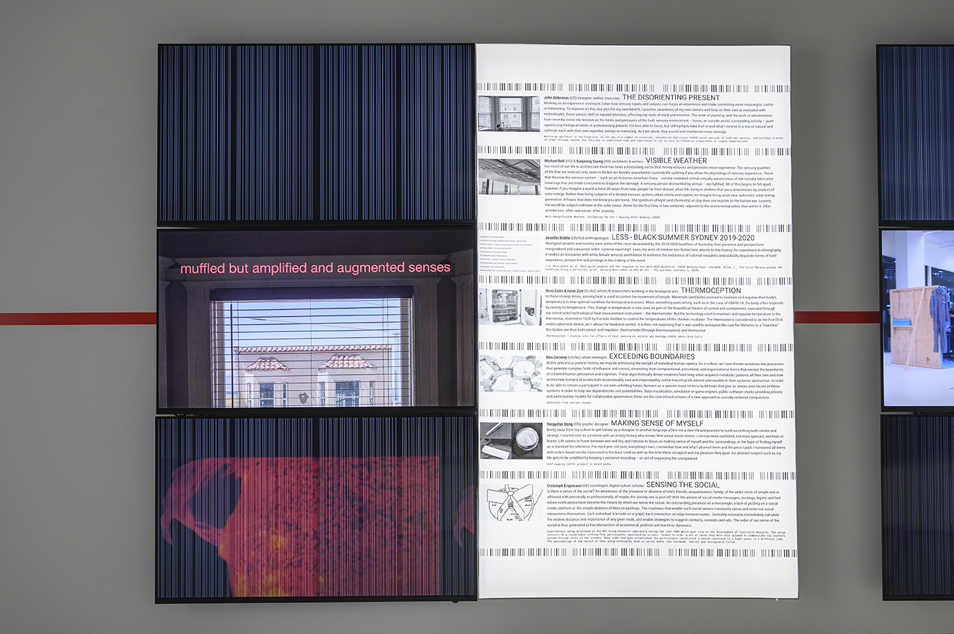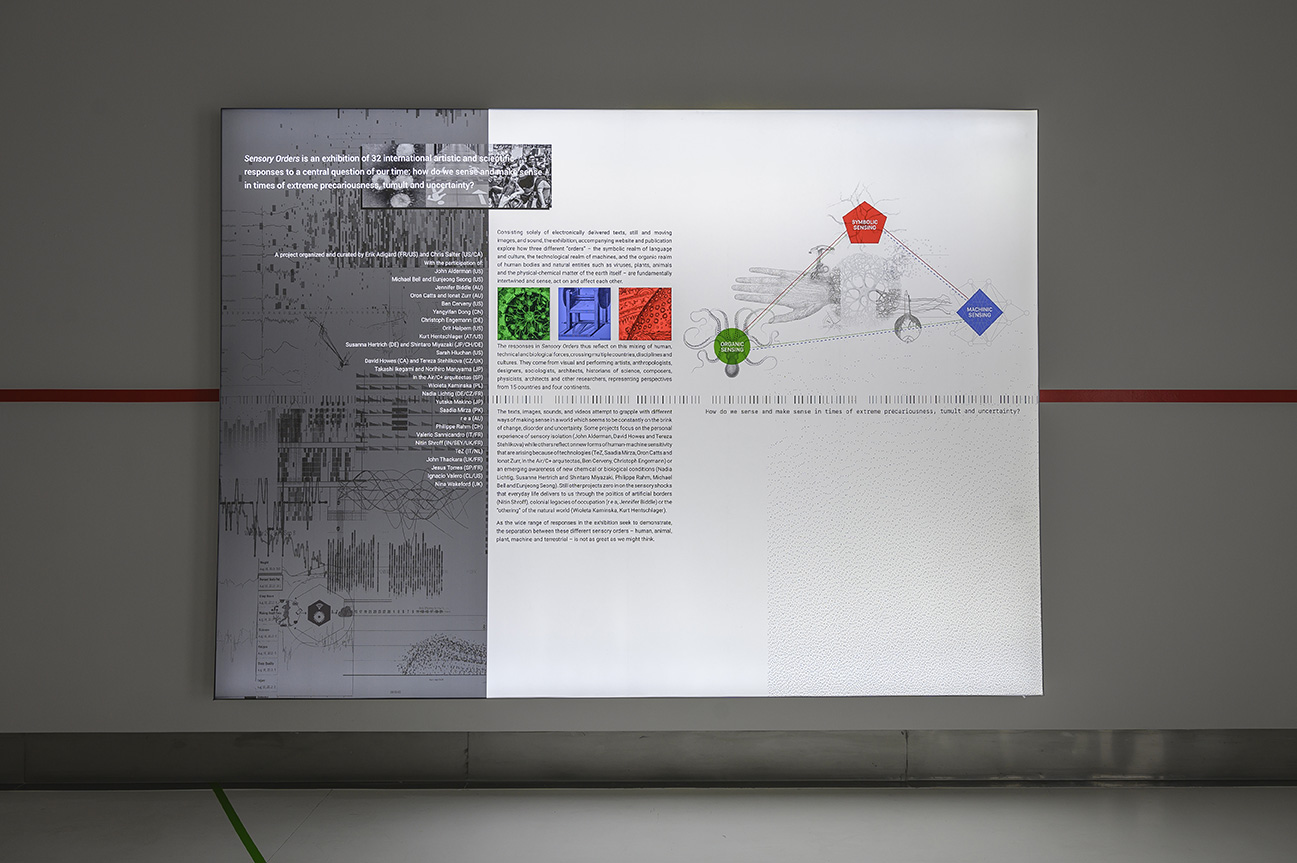 The texts, images, sounds and videos that make up the exhibition thus attempt to grapple with different ways of making sense in a world which seems to be constantly on the brink of change, disorder and uncertainty. Some projects focus on the personal experience of sensory isolation (John Aldemann, David Howes and Tereza Stehlikova) while others reflect on new forms of human-machine sensitivity that are arising because of technologies (TeZ, Saadia Mirza, Oron Catts and Ionat Zurr, Nerea Calvillo, Ben Cerveny, Christoph Engemann) or an emerging awareness of new chemical or biological conditions (Nadia Lichtig, Susanne Hertrich and Shintaro Miyazaki, Philippe Rahm, Michael Bell and Eunjeong Seong). Still other projects zero in on the sensory shocks that everyday life is increasingly delivering to us through the politics of artificial borders’ (Nitin Shroff), colonial legacies of occupation (r e a, Jennifer Biddle) or the increasing “othering” of the natural world (Wioleta Kaminska, Kurt Hentschlager).